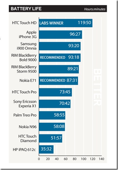 המכשיר גם זכה בתואר (המפוקפק?) "הטלפון הגברי ביותר לשנת 2008", וכעת, פרסם האתר PC Authority את תוצאות מבחן אורך חיי סוללה שערכו בקרב המכשירים הפופולריים ביותר: