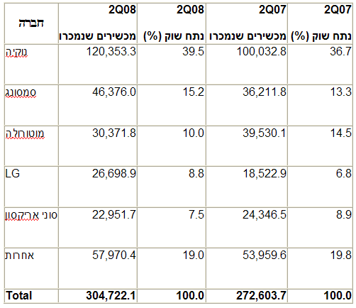 מבין יצרניות המכשירים, נמצאת נוקיה במקום הראשון עם מכירות של 120.4 מיליון מכשירים ונתח שוק עולמי של 39.5%. בגרטנר צופים כי נוקיה תגדיל את נתח השוק שלה במחצית השניה של השנה, בעיקר הודות לעובדה כי מכשירה החדש והמצופה בעל מסך המגע, שאמור להתחרות עם ה-iPhone, צפוי להיות זול יחסית, מה שיסייע לנוקיה להגביר את כמות המכירות.