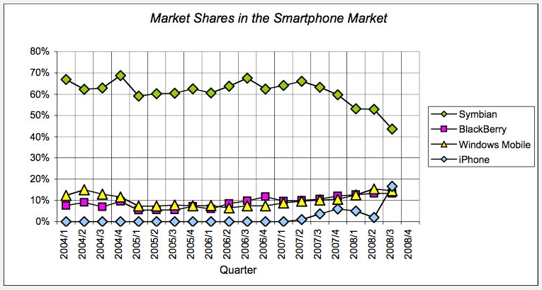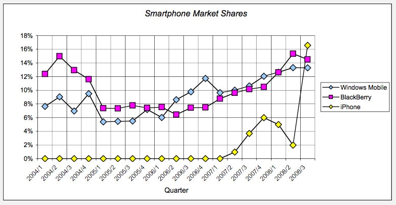 נתח השוק של Windows Mobileהולך וקטן. על פי נתוני האתר Fortune, במחצית השניה של 2008, מכשיר ה-iPhone של Apple הינו בעל נתח השוק הגדול ביותר. במקום השני ניצבת חברת RIM ומיקרוסופט במקום השלישי: